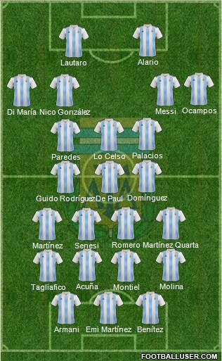 Armani · Emi Martínez · Benítez · Tagliafico · Montiel · Acuña · Molina · Martínez · Senesi · Romero · Martínez Quarta · Guido Rodríguez · De Paul · Domínguez · Paredes · Lo Celso · Palacios · Di María · Nico González · Messi · Ocampos · Lautaro · AlarioLOS 23 DE ARGENTINA COPA AMÉRICA 2021