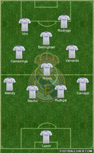 Lunin · Nacho · Rudiger · Mendy · Carvajal · Kroos · Camavinga · Valverde · Bellingham · Vini · Rodrygo