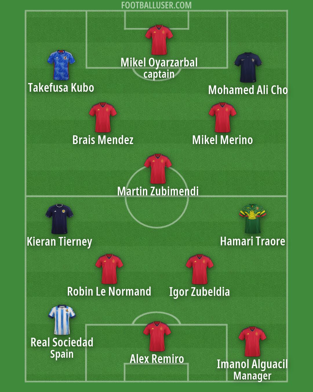 Alex Remiro (Spain) · Robin Le Normand (Spain) · Igor Zubeldia (Spain) · Hamari Traore (Mali) · Kieran Tierney (Scotland) · Martin Zubimendi (Spain) · Mikel Merino (Spain) · Brais Mendez (Spain) · Mikel Oyarzarbal (captain) (Spain) · Takefusa Kubo (Japan) · Mohamed Ali Cho (France) · Imanol Alguacil (Manager) (Spain) · Real Sociedad (Spain) (Real Sociedad)