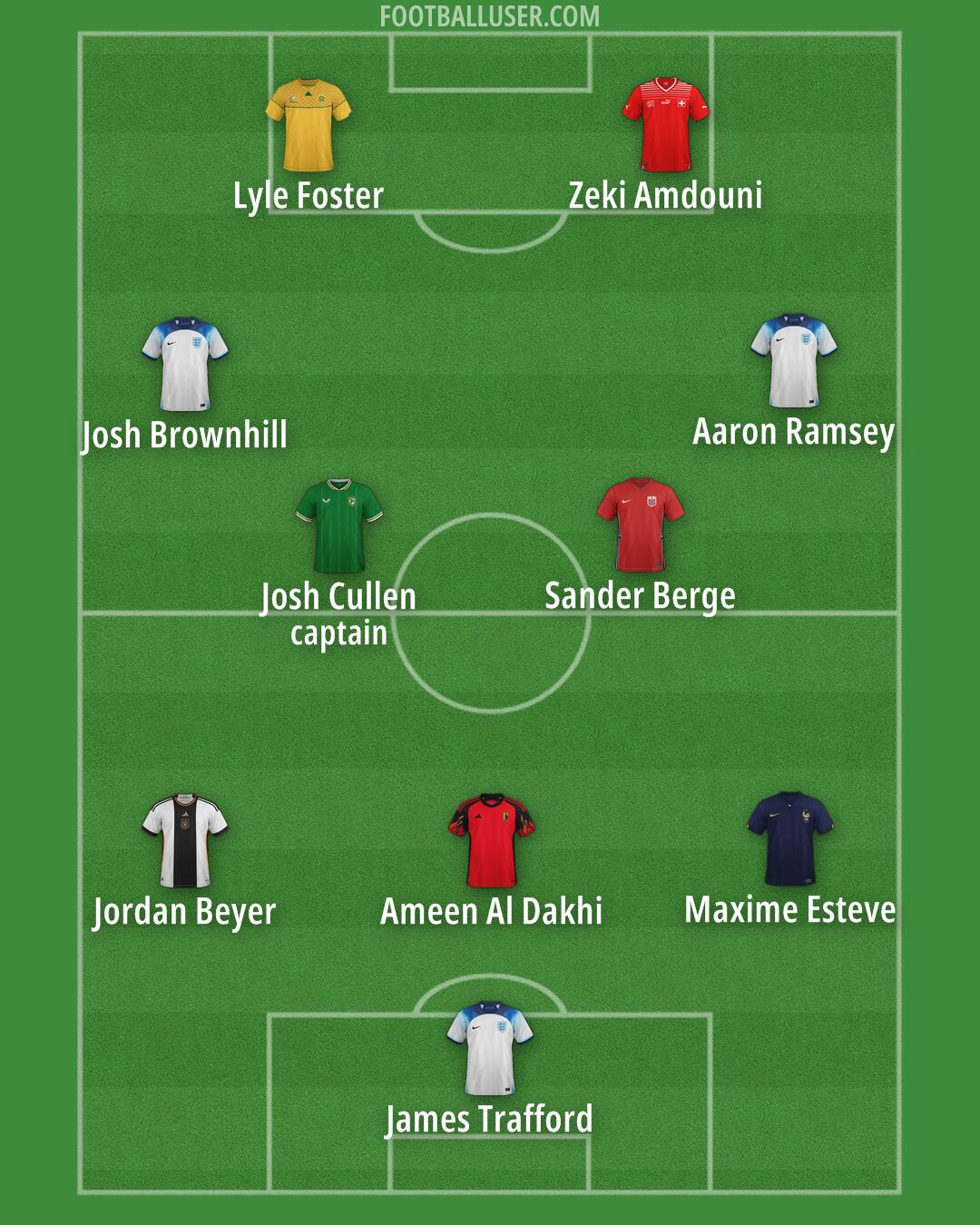 James Trafford (England) · Jordan Beyer (Germany) · Ameen Al Dakhi (Belgium) · Maxime Esteve (France) · Josh Cullen (captain) (Republic of Ireland) · Sander Berge (Norway) · Josh Brownhill (England) · Aaron Ramsey (England) · Lyle Foster (South Africa) · Zeki Amdouni (Switzerland)
