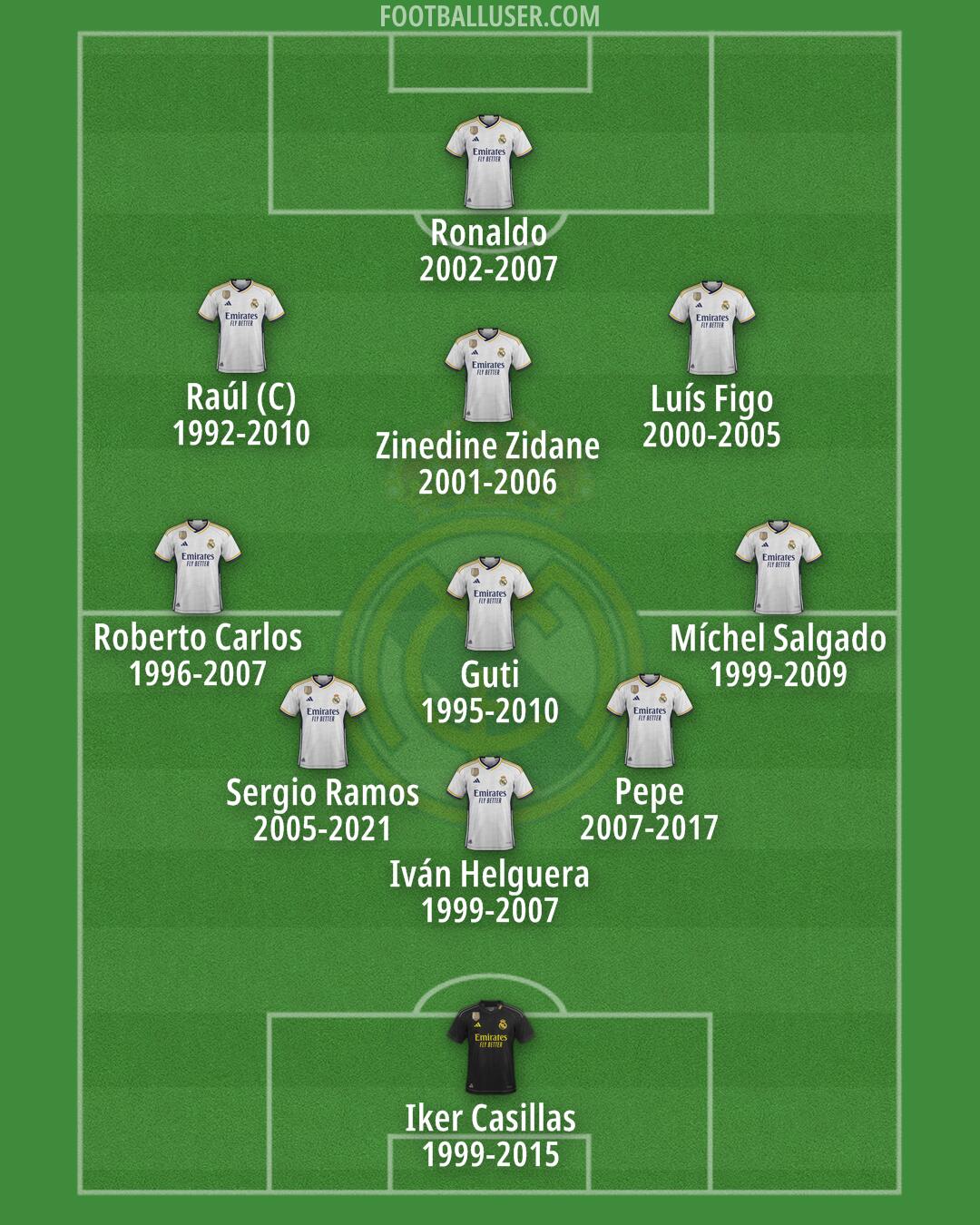 Iker Casillas (1999-2015) · Iván Helguera (1999-2007) · Zinedine Zidane (2001-2006) · Míchel Salgado (1999-2009) · Sergio Ramos (2005-2021) · Raúl (C) (1992-2010) · Pepe (2007-2017) · Roberto Carlos (1996-2007) · Guti (1995-2010) · Ronaldo (2002-2007) · Luís Figo (2000-2005)President : Florentino Pérez