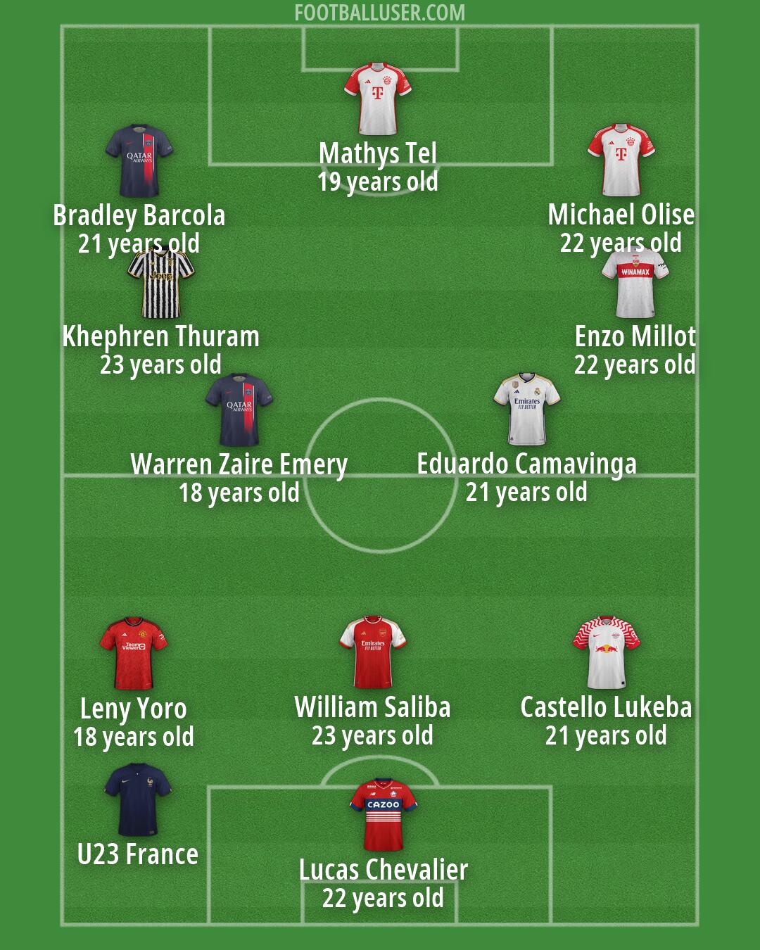 Lucas Chevalier (22 years old) (Lille) · Leny Yoro (18 years old) (Man Utd) · William Saliba (23 years old) (Arsenal) · Castello Lukeba (21 years old) (RB Leipzig) · Enzo Millot (22 years old) (Stuttgart) · Khephren Thuram (23 years old) (Juventus) · Warren Zaire Emery (18 years old) (PSG) · Eduardo Camavinga (21 years old) (Real Madrid) · Bradley Barcola (21 years old) (PSG) · Michael Olise (22 years old) (FC Bayern) · Mathys Tel (19 years old) (FC Bayern) · U23 France (France)