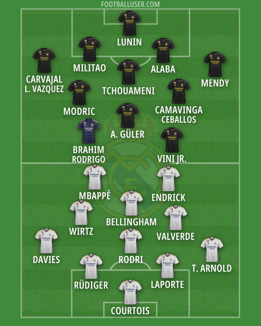 COURTOIS · T. ARNOLD · LAPORTE · RÜDIGER · DAVIES · RODRI · VALVERDE · WIRTZ · MBAPPÉ · BELLINGHAM · ENDRICK · LUNIN · CARVAJAL (L. VAZQUEZ) · MILITAO · ALABA · MENDY · TCHOUAMENI · MODRIC · CAMAVINGA (CEBALLOS) · A. GÜLER · BRAHIM (RODRIGO) · VINI JR.