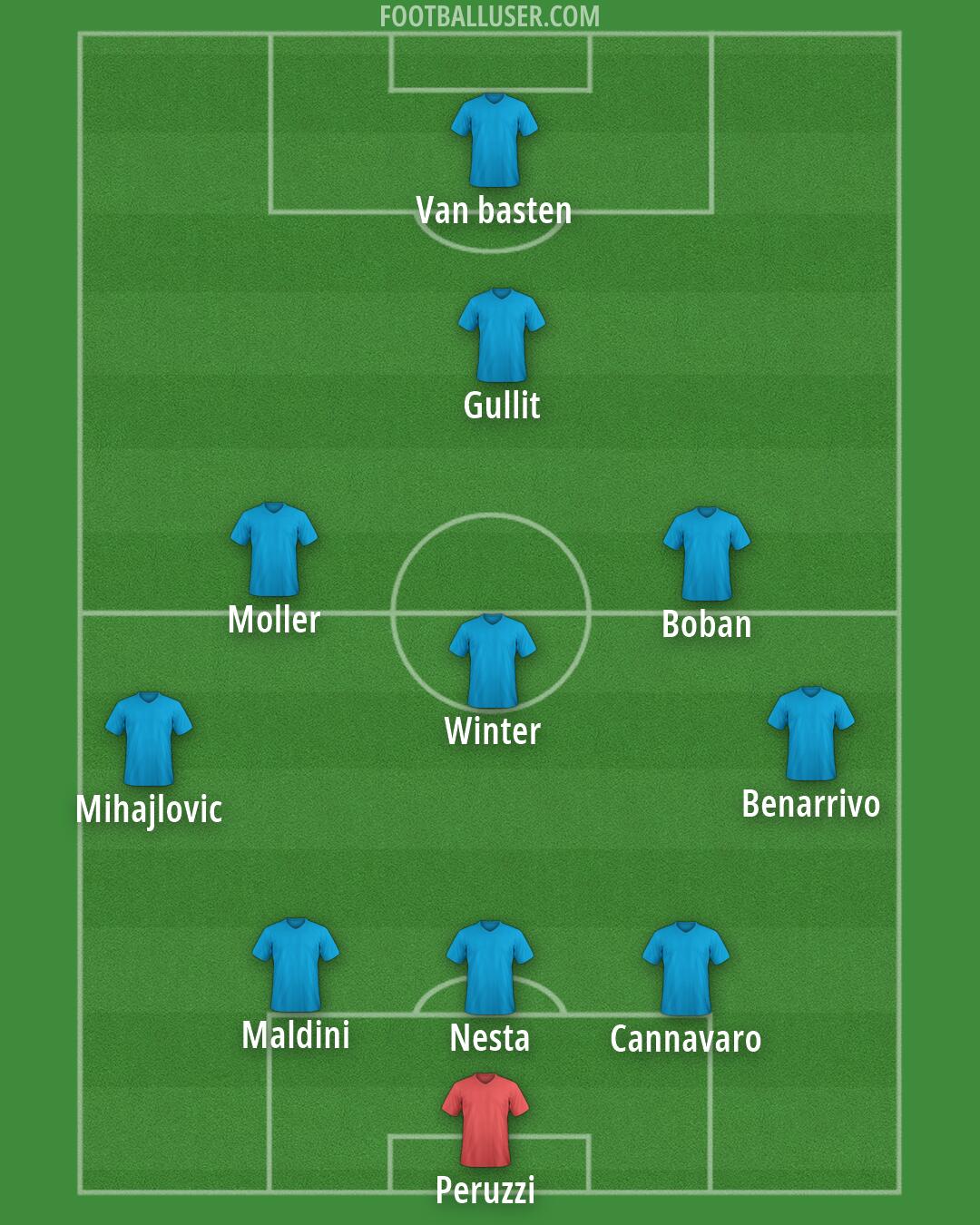 Peruzzi · Nesta · Cannavaro · Maldini · Mihajlovic · Benarrivo · Winter · Moller · Boban · Gullit · Van basten