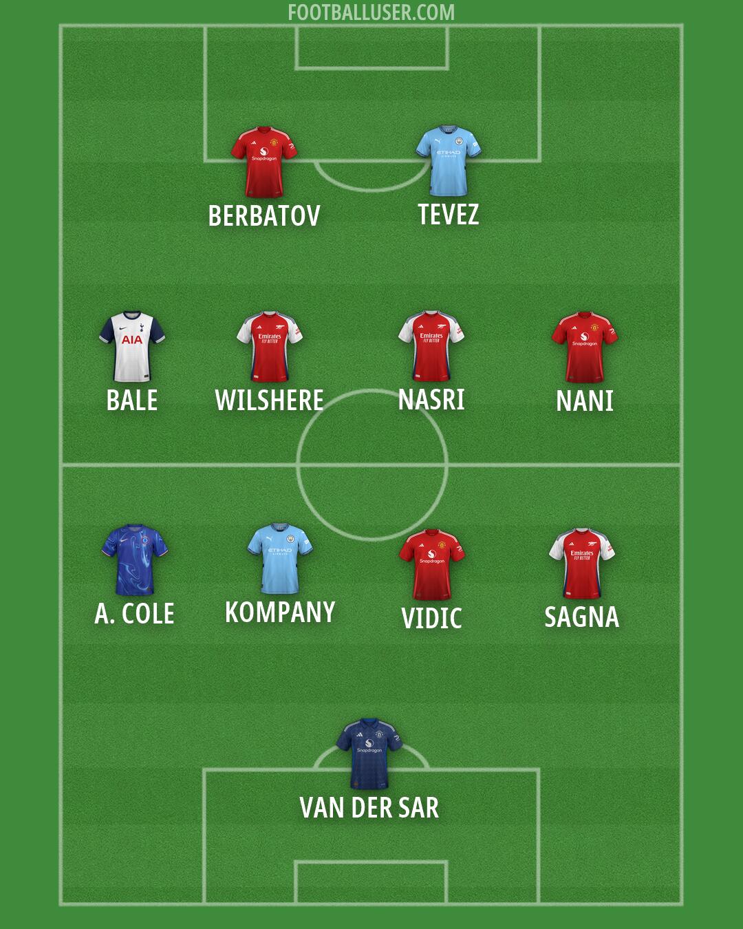 VAN DER SAR (Man Utd) · VIDIC (Man Utd) · NANI (Man Utd) · BERBATOV (Man Utd) · WILSHERE (Arsenal) · NASRI (Arsenal) · SAGNA (Arsenal) · BALE (Tottenham) · TEVEZ (Man City) · KOMPANY (Man City) · A. COLE (Chelsea)
