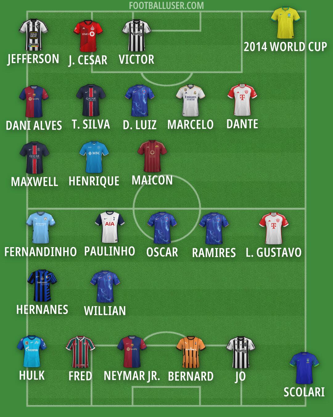 2014 WORLD CUP (Brazil) · SCOLARI (Brazil) · JEFFERSON (Botafogo) · J. CESAR (Toronto FC) · VICTOR (Atlético Mineiro) · DANI ALVES (Barcelona) · T. SILVA (PSG) · D. LUIZ (Chelsea) · MARCELO (Real Madrid) · DANTE (FC Bayern) · MAXWELL (PSG) · HENRIQUE (Napoli) · MAICON (Roma) · FERNANDINHO (Man City) · PAULINHO (Tottenham) · OSCAR (Chelsea) · RAMIRES (Chelsea) · L. GUSTAVO (FC Bayern) · HERNANES (Inter) · WILLIAN (Chelsea) · HULK (Zenit) · FRED (Fluminense) · NEYMAR JR. (Barcelona) · BERNARD (Shakhtar) · JO (Atlético Mineiro)