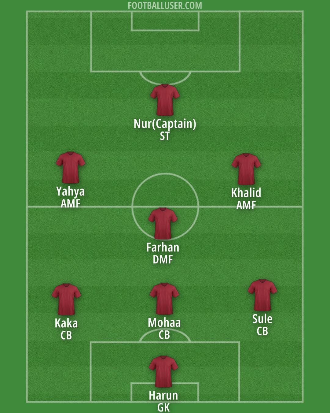 Harun (GK) · Mohaa (CB) · Sule (CB) · Kaka (CB) · Farhan (DMF) · Khalid (AMF) · Yahya (AMF) · Nur(Captain) (ST)