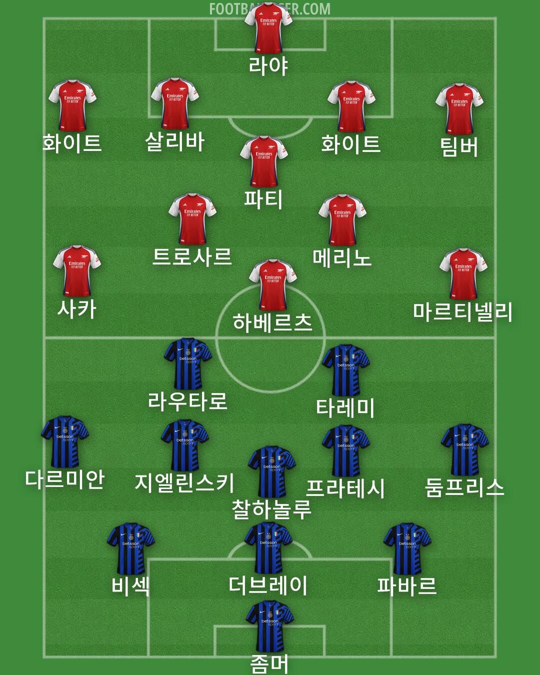 좀머 (Inter) · 파바르 (Inter) · 더브레이 (Inter) · 비섹 (Inter) · 다르미안 (Inter) · 지엘린스키 (Inter) · 찰하놀루 (Inter) · 프라테시 (Inter) · 둠프리스 (Inter) · 라우타로 (Inter) · 타레미 (Inter) · 라야 (Arsenal) · 살리바 (Arsenal) · 화이트 (Arsenal) · 화이트 (Arsenal) · 팀버 (Arsenal) · 파티 (Arsenal) · 메리노 (Arsenal) · 트로사르 (Arsenal) · 사카 (Arsenal) · 하베르츠 (Arsenal) · 마르티넬리 (Arsenal)