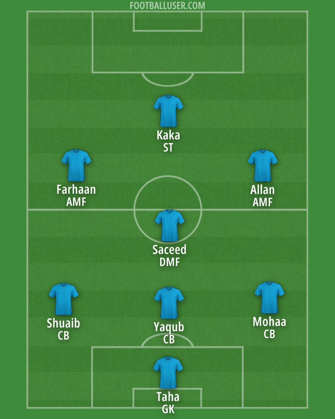 Taha (GK) · Yaqub (CB) · Mohaa (CB) · Shuaib (CB) · Saceed (DMF) · Allan (AMF) · Farhaan (AMF) · Kaka (ST)