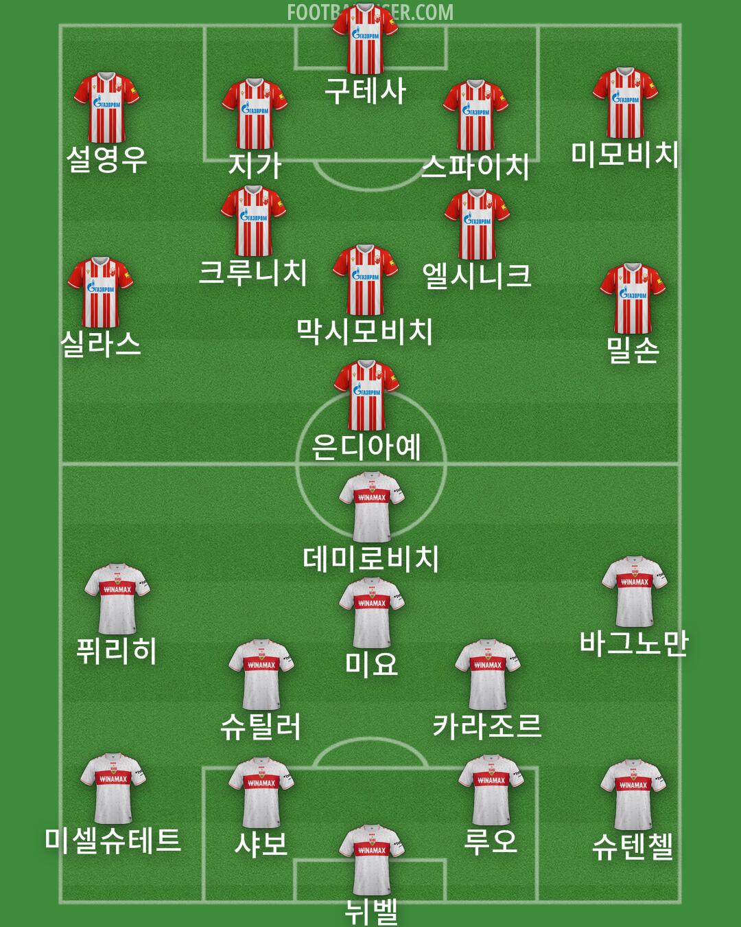 구테사 (Crvena zvezda) · 설영우 (Crvena zvezda) · 지가 (Crvena zvezda) · 스파이치 (Crvena zvezda) · 미모비치 (Crvena zvezda) · 크루니치 (Crvena zvezda) · 엘시니크 (Crvena zvezda) · 막시모비치 (Crvena zvezda) · 실라스 (Crvena zvezda) · 밀손 (Crvena zvezda) · 은디아예 (Crvena zvezda) · 뉘벨 (Stuttgart) · 루오 (Stuttgart) · 샤보 (Stuttgart) · 미셀슈테트 (Stuttgart) · 슈텐첼 (Stuttgart) · 슈틸러 (Stuttgart) · 카라조르 (Stuttgart) · 바그노만 (Stuttgart) · 미요 (Stuttgart) · 퓌리히 (Stuttgart) · 데미로비치 (Stuttgart)