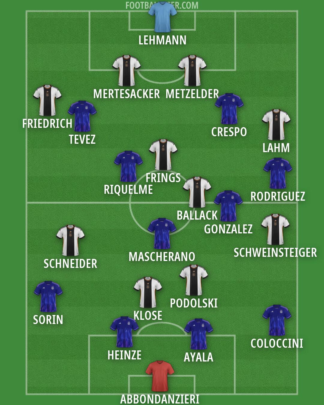 LEHMANN (Germany) · MERTESACKER (Germany) · METZELDER (Germany) · FRIEDRICH (Germany) · LAHM (Germany) · FRINGS (Germany) · BALLACK (Germany) · SCHNEIDER (Germany) · SCHWEINSTEIGER (Germany) · KLOSE (Germany) · PODOLSKI (Germany) · ABBONDANZIERI (Argentina) · COLOCCINI (Argentina) · AYALA (Argentina) · HEINZE (Argentina) · SORIN (Argentina) · GONZALEZ (Argentina) · MASCHERANO (Argentina) · RODRIGUEZ (Argentina) · RIQUELME (Argentina) · TEVEZ (Argentina) · CRESPO (Argentina)30/06/2006 Germany-Argentina 1-1, 4-2 after penalties (49 Ayala, 80 Klose)