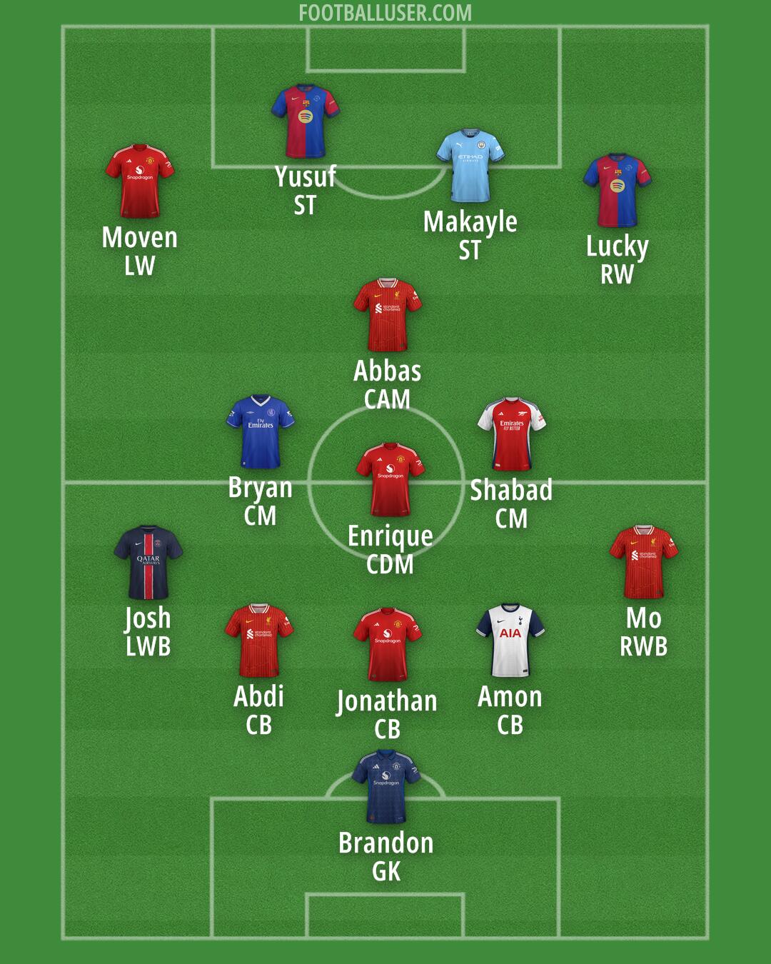 Makayle (ST) (Man City) · Abbas (CAM) (Liverpool) · Mo (RWB) (Liverpool) · Shabad (CM) (Arsenal) · Josh (LWB) (PSG) · Bryan (CM) (Chelsea) · Brandon (GK) (Man Utd) · Abdi (CB) (Liverpool) · Jonathan (CB) (Man Utd) · Moven (LW) (Man Utd) · Enrique (CDM) (Man Utd) · Amon (CB) (Tottenham) · Yusuf (ST) (Barcelona) · Lucky (RW) (Barcelona)