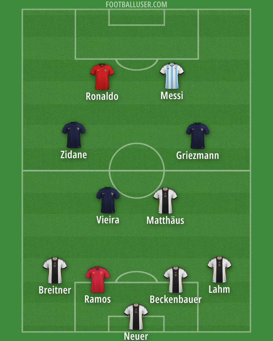 Neuer (Germany) · Beckenbauer (Germany) · Ramos (Spain) · Lahm (Germany) · Breitner (Germany) · Matthäus (Germany) · Vieira (France) · Messi (Argentina) · Ronaldo (Portugal) · Griezmann (France) · Zidane (France)
