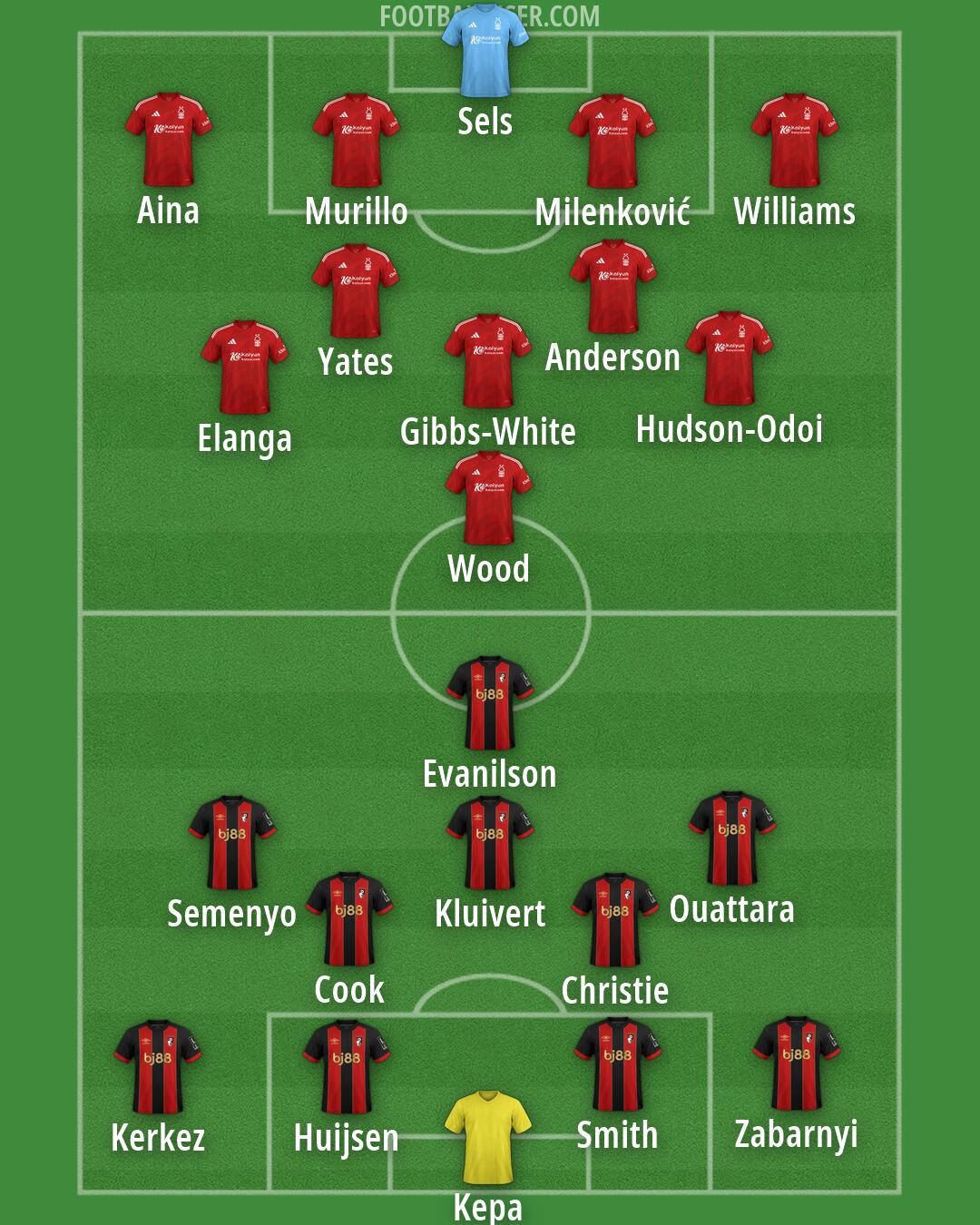Kepa (Bournemouth) · Smith (Bournemouth) · Zabarnyi (Bournemouth) · Huijsen (Bournemouth) · Kerkez (Bournemouth) · Cook (Bournemouth) · Christie (Bournemouth) · Kluivert (Bournemouth) · Ouattara (Bournemouth) · Semenyo (Bournemouth) · Evanilson (Bournemouth) · Sels (Nottm Forest) · Murillo (Nottm Forest) · Milenković (Nottm Forest) · Williams (Nottm Forest) · Aina (Nottm Forest) · Yates (Nottm Forest) · Anderson (Nottm Forest) · Elanga (Nottm Forest) · Gibbs-White (Nottm Forest) · Hudson-Odoi (Nottm Forest) · Wood (Nottm Forest)