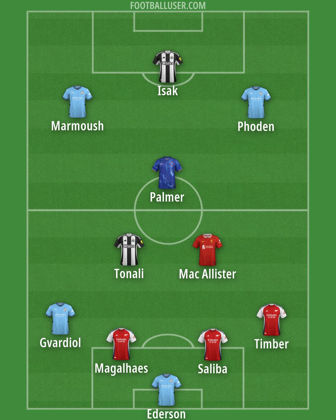 Ederson (Man City) · Saliba (Arsenal) · Magalhaes (Arsenal) · Timber (Arsenal) · Gvardiol (Man City) · Marmoush (Man City) · Palmer (Chelsea) · Tonali (Newcastle) · Mac Allister (Liverpool) · Isak (Newcastle) · Phoden (Man City)