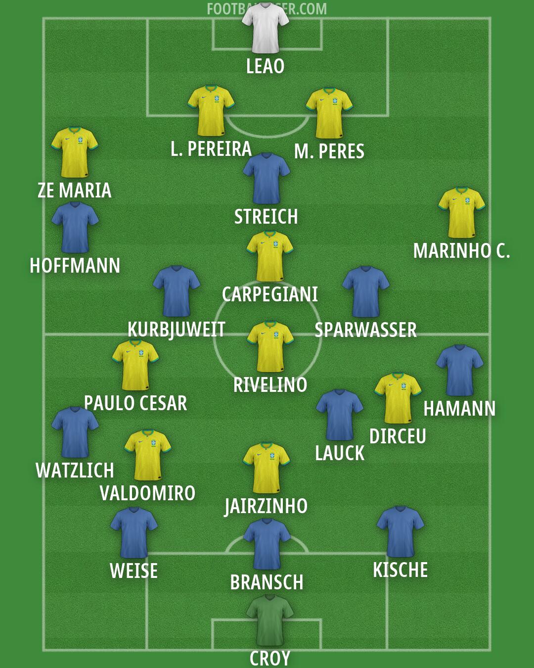LEAO (Brazil) · ZE MARIA (Brazil) · L. PEREIRA (Brazil) · M. PERES (Brazil) · MARINHO C. (Brazil) · CARPEGIANI (Brazil) · PAULO CESAR (Brazil) · RIVELINO (Brazil) · JAIRZINHO (Brazil) · VALDOMIRO (Brazil) · DIRCEU (Brazil) · CROY · LAUCK · BRANSCH · WEISE · HOFFMANN · HAMANN · SPARWASSER · WATZLICH · KURBJUWEIT · KISCHE · STREICH26/06/1974 Brazil-East Germany 1-0 (61 Rivelino)