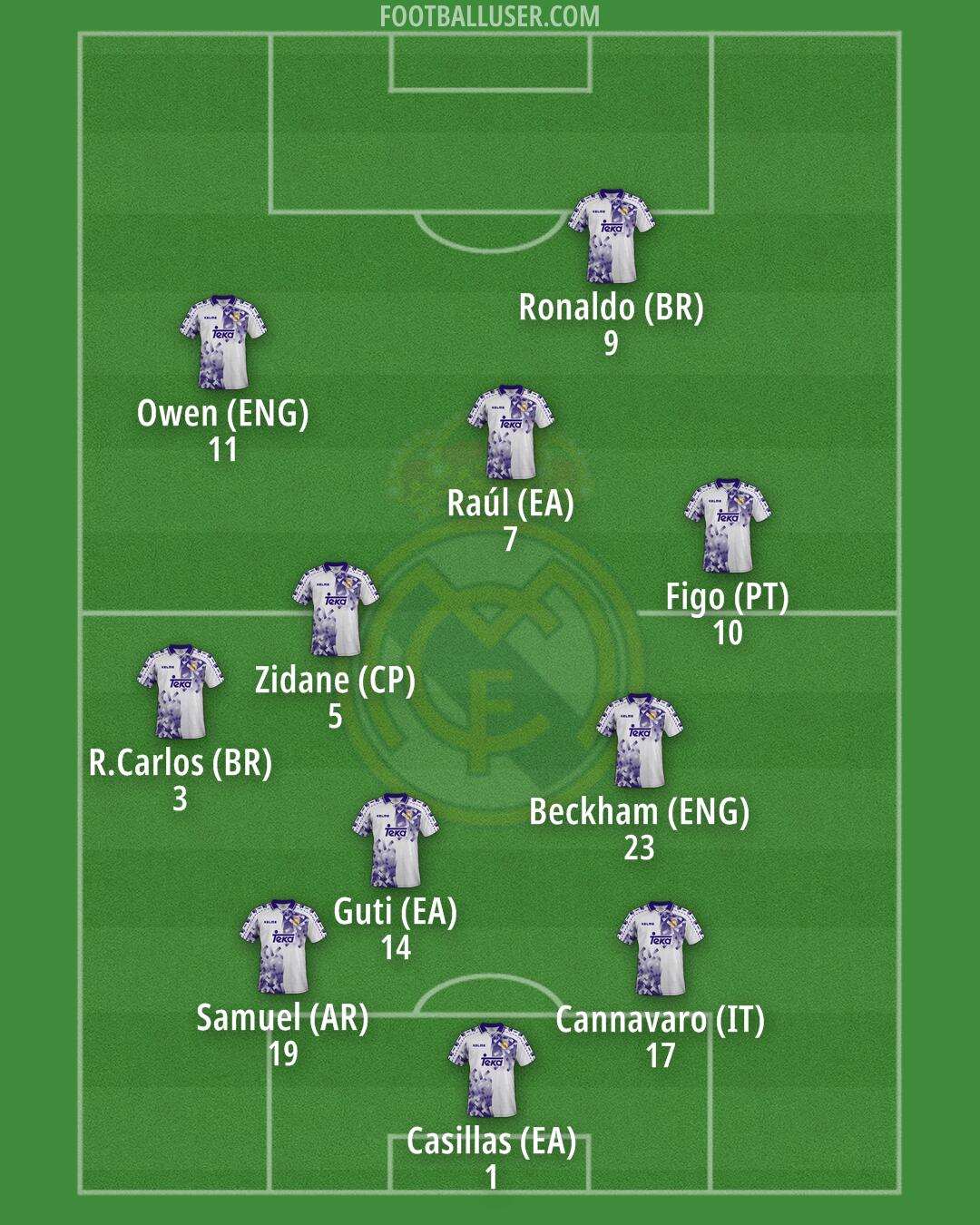 Casillas 馃嚜馃嚘 (1) 路 Beckham 馃彺鬆仹鬆仮鬆仴鬆伄鬆仹鬆伩 (23) 路 Guti 馃嚜馃嚘 (14) 路 Zidane 馃嚚馃嚨 (5) 路 Figo 馃嚨馃嚬 (10) 路 Owen 馃彺鬆仹鬆仮鬆仴鬆伄鬆仹鬆伩 (11) 路 Raúl 馃嚜馃嚘 (7) 路 R.Carlos 馃嚙馃嚪 (3) 路 Samuel 馃嚘馃嚪 (19) 路 Cannavaro 馃嚠馃嚬 (17) 路 Ronaldo 馃嚙馃嚪 (9)