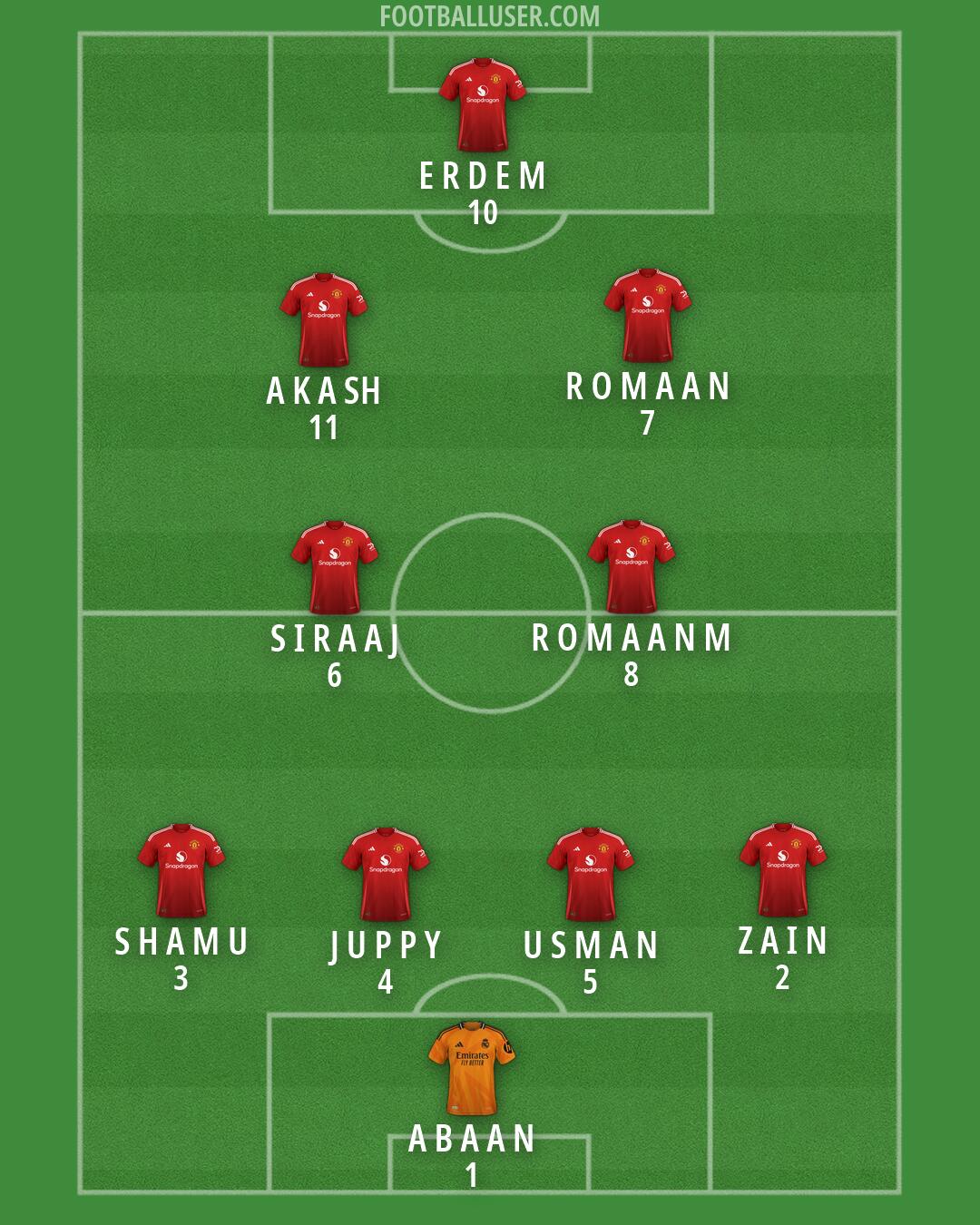 R O M A A N (7) (Man Utd) · S I R A A J (6) (Man Utd) · A K A SH (11) (Man Utd) · U S M A N (5) (Man Utd) · R O M A A N M (8) (Man Utd) · A B A A N (1) (Real Madrid) · Z A I N (2) (Man Utd) · S H A M U (3) (Man Utd) · J U P P Y (4) (Man Utd) · E R D E M (10) (Man Utd)