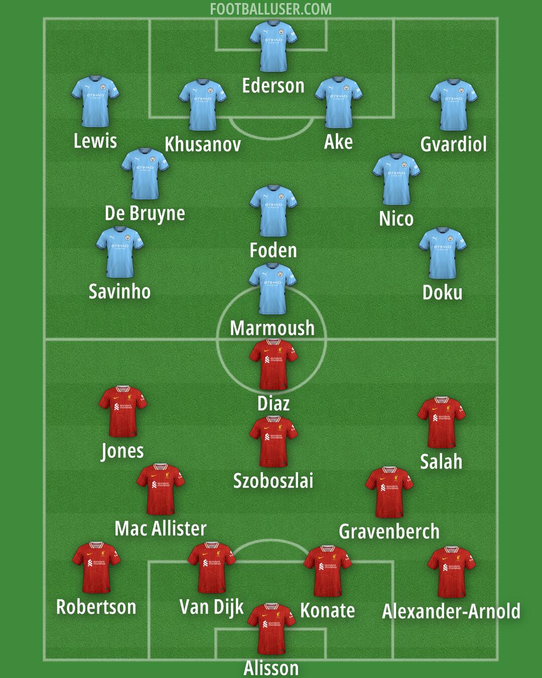 Alisson (Liverpool) · Alexander-Arnold (Liverpool) · Konate (Liverpool) · Van Dijk (Liverpool) · Robertson (Liverpool) · Gravenberch (Liverpool) · Mac Allister (Liverpool) · Szoboszlai (Liverpool) · Diaz (Liverpool) · Salah (Liverpool) · Jones (Liverpool) · Marmoush (Man City) · Foden (Man City) · Doku (Man City) · Savinho (Man City) · Gvardiol (Man City) · Lewis (Man City) · Khusanov (Man City) · Ake (Man City) · Ederson (Man City) · Nico (Man City) · De Bruyne (Man City)Man City v Liverpool 2/23/2025