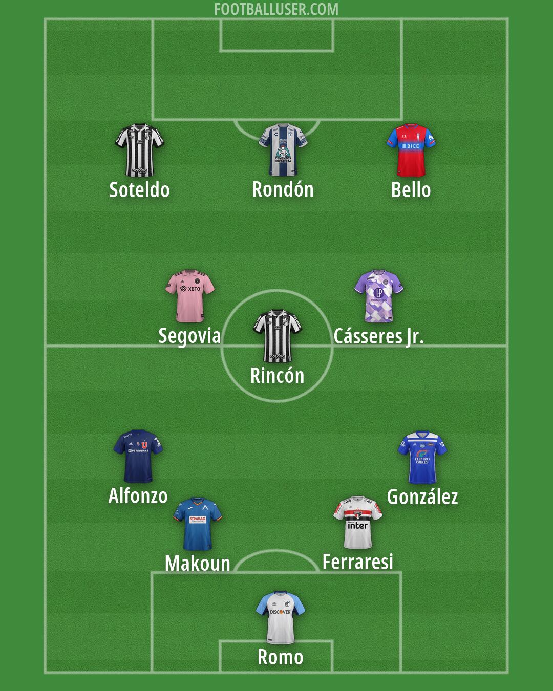 Romo (U. Católica (Quito)) · Ferraresi (São Paulo) · Makoun (Levski) · Alfonzo (Univ. de Chile) · Soteldo (Santos) · González (Emelec) · Cásseres Jr. (Toulouse) · Rincón (Santos) · Bello (Univ. Católica) · Rondón (Pachuca) · Segovia (Inter Miami)
