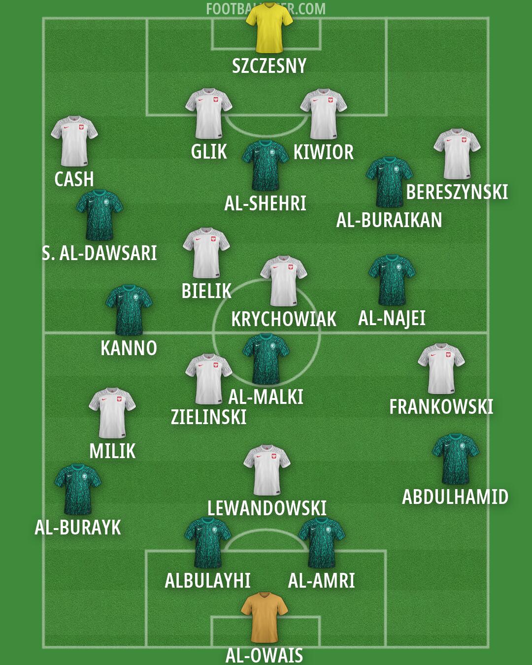 AL-OWAIS (Saudi Arabia) · ABDULHAMID (Saudi Arabia) · AL-AMRI (Saudi Arabia) · ALBULAYHI (Saudi Arabia) · AL-BURAYK (Saudi Arabia) · AL-MALKI (Saudi Arabia) · AL-NAJEI (Saudi Arabia) · AL-BURAIKAN (Saudi Arabia) · KANNO (Saudi Arabia) · S. AL-DAWSARI (Saudi Arabia) · AL-SHEHRI (Saudi Arabia) · SZCZESNY (Poland) · BERESZYNSKI (Poland) · GLIK (Poland) · KIWIOR (Poland) · CASH (Poland) · FRANKOWSKI (Poland) · BIELIK (Poland) · KRYCHOWIAK (Poland) · ZIELINSKI (Poland) · MILIK (Poland) · LEWANDOWSKI (Poland)26/11/2022 Poland-Saudi Arabia 2-0 (39 Zielinski, 82 Lewandowski)