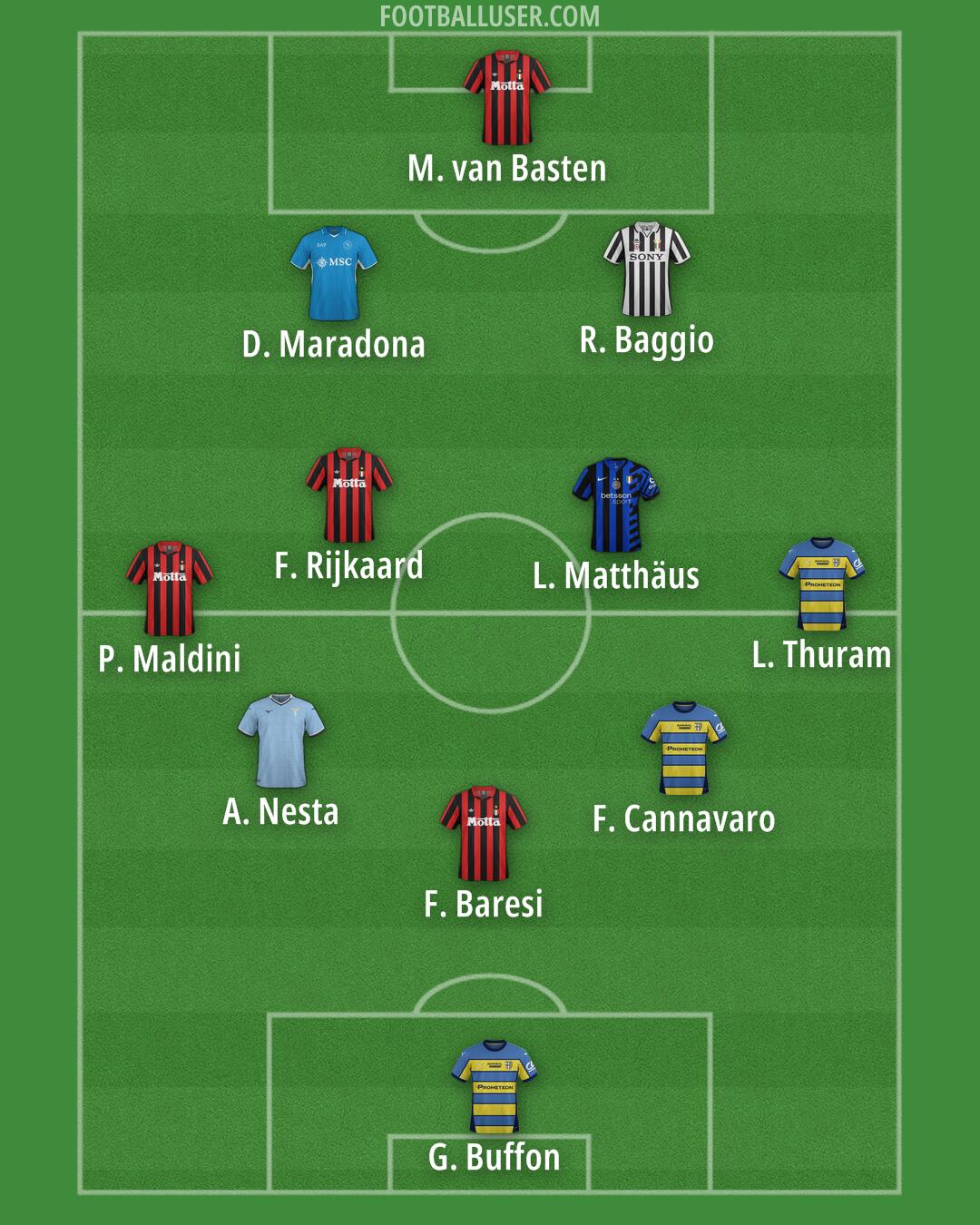 G. Buffon (Parma) · L. Thuram (Parma) · P. Maldini (Milan) · A. Nesta (Lazio) · F. Cannavaro (Parma) · F. Baresi (Milan) · F. Rijkaard (Milan) · L. Matthäus (Inter) · D. Maradona (Napoli) · R. Baggio (Juventus) · M. van Basten (Milan)