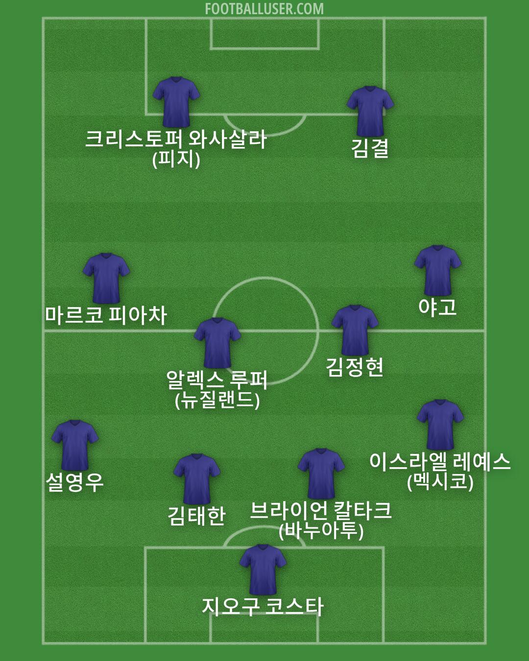 크리스토퍼 와사살라 (피지) · 김결 · 마르코 피아차 · 알렉스 루퍼 (뉴질랜드) · 김정현 · 야고 · 설영우 · 김태한 · 브라이언 칼타크 (바누아투) · 이스라엘 레예스 (멕시코) · 지오구 코스타