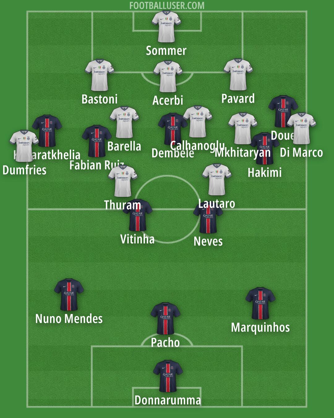Donnarumma (PSG) · Nuno Mendes (PSG) · Pacho (PSG) · Marquinhos (PSG) · Hakimi (PSG) · Vitinha (PSG) · Fabian Ruiz (PSG) · Neves (PSG) · Khvaratkhelia (PSG) · Dembele (PSG) · Doue (PSG) · Sommer (Inter) · Bastoni (Inter) · Acerbi (Inter) · Pavard (Inter) · Calhanoglu (Inter) · Barella (Inter) · Mkhitaryan (Inter) · Dumfries (Inter) · Di Marco (Inter) · Thuram (Inter) · Lautaro (Inter)