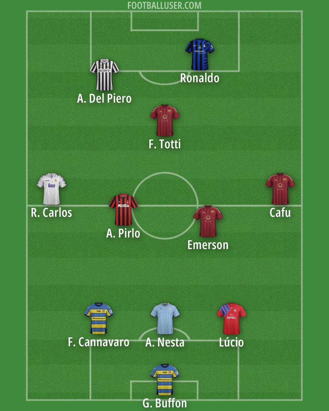 G. Buffon (Parma) · Lúcio (FC Bayern) · F. Cannavaro (Parma) · Emerson (Roma) · Cafu (Roma) · A. Pirlo (Milan) · F. Totti (Roma) · A. Del Piero (Juventus) · Ronaldo (Inter) · R. Carlos (Real Madrid) · A. Nesta (Lazio)La mia top 11 con i migliori giocatori brasiliani e italiani nati negli anni '70.