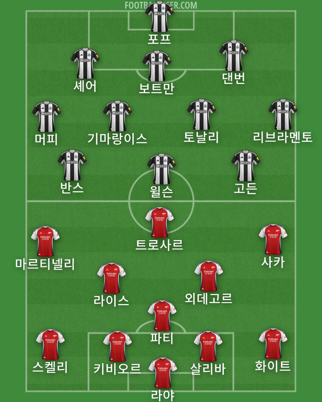 라야 (Arsenal) · 살리바 (Arsenal) · 화이트 (Arsenal) · 키비오르 (Arsenal) · 스켈리 (Arsenal) · 파티 (Arsenal) · 라이스 (Arsenal) · 외데고르 (Arsenal) · 사카 (Arsenal) · 마르티넬리 (Arsenal) · 트로사르 (Arsenal) · 포프 (Newcastle) · 셰어 (Newcastle) · 보트만 (Newcastle) · 댄번 (Newcastle) · 리브라멘토 (Newcastle) · 머피 (Newcastle) · 기마랑이스 (Newcastle) · 토날리 (Newcastle) · 반스 (Newcastle) · 윌슨 (Newcastle) · 고든 (Newcastle)
