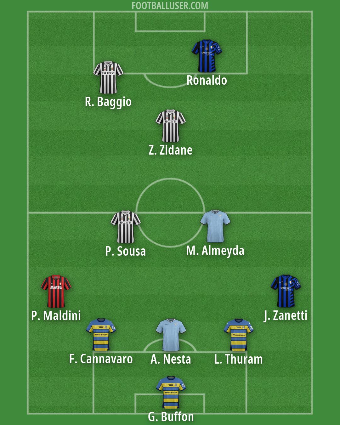 G. Buffon (Parma) · A. Nesta (Lazio) · F. Cannavaro (Parma) · L. Thuram (Parma) · P. Maldini (Milan) · J. Zanetti (Inter) · P. Sousa (Juventus) · M. Almeyda (Lazio) · Z. Zidane (Juventus) · R. Baggio (Juventus) · Ronaldo (Inter)