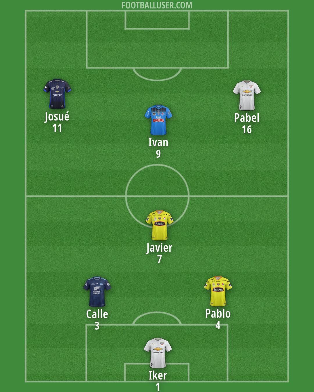 Ivan (9) (Manta) · Javier (7) (Barcelona S.C.) · Josué (11) (Independiente del Valle) · Pabel (16) (Liga de Quito) · Calle (3) (Emelec) · Pablo (4) (Barcelona S.C.) · Iker (1) (Liga de Quito)Pichanga VII