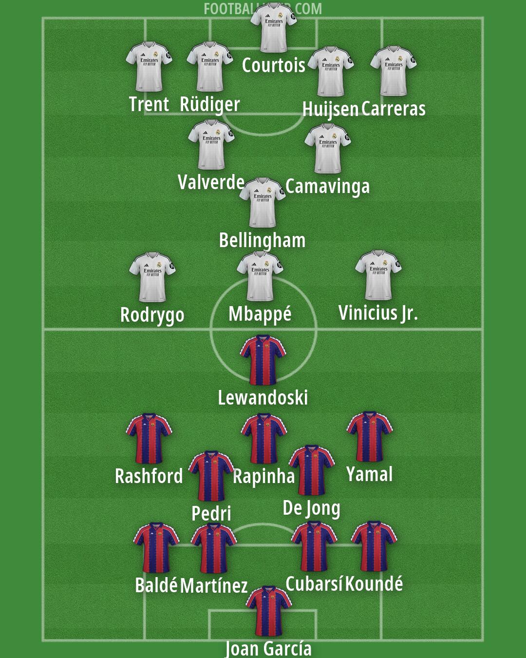 Rashford (Barcelona) · Rapinha (Barcelona) · Yamal (Barcelona) · Joan García (Barcelona) · Martínez (Barcelona) · Cubarsí (Barcelona) · Baldé (Barcelona) · Koundé (Barcelona) · Pedri (Barcelona) · De Jong (Barcelona) · Lewandoski (Barcelona) · Vinicius Jr. (Real Madrid) · Bellingham (Real Madrid) · Mbappé (Real Madrid) · Carreras (Real Madrid) · Trent (Real Madrid) · Valverde (Real Madrid) · Camavinga (Real Madrid) · Rodrygo (Real Madrid) · Rüdiger (Real Madrid) · Huijsen (Real Madrid) · Courtois (Real Madrid)