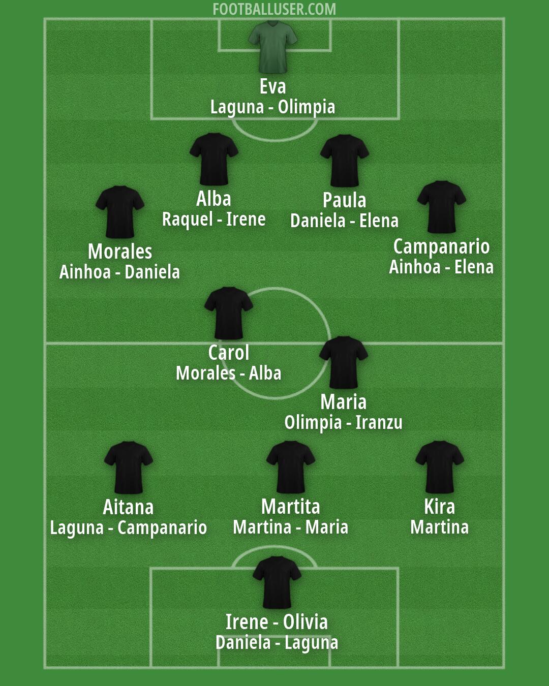 Eva (Laguna - Olimpia) · Alba (Raquel - Irene) · Paula (Daniela - Elena) · Morales (Ainhoa - Daniela) · Campanario (Ainhoa - Elena) · Carol (Morales - Alba) · Maria (Olimpia - Iranzu) · Aitana (Laguna - Campanario) · Martita (Martina - Maria) · Kira (Martina) · Irene - Olivia (Daniela - Laguna)