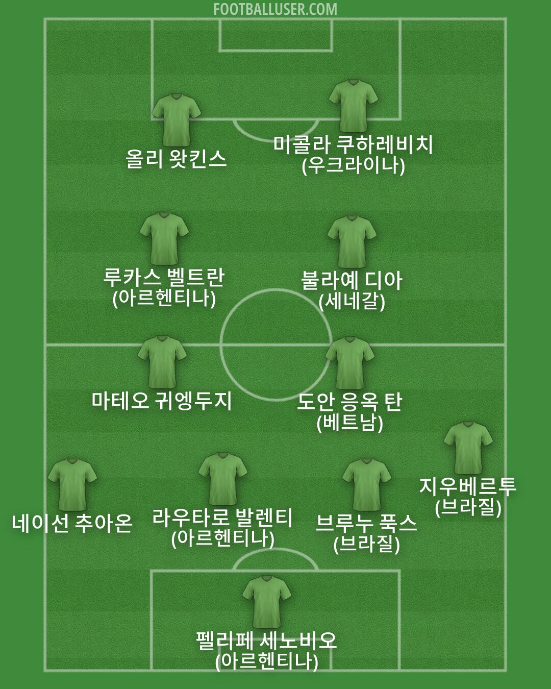 올리 왓킨스 · 미콜라 쿠하레비치 (우크라이나) · 루카스 벨트란 (아르헨티나) · 불라예 디아 (세네갈) · 마테오 귀엥두지 · 도안 응옥 탄 (베트남) · 네이선 추아온 · 라우타로 발렌티 (아르헨티나) · 브루누 푹스 (브라질) · 지우베르투 (브라질) · 펠리페 세노비오 (아르헨티나)