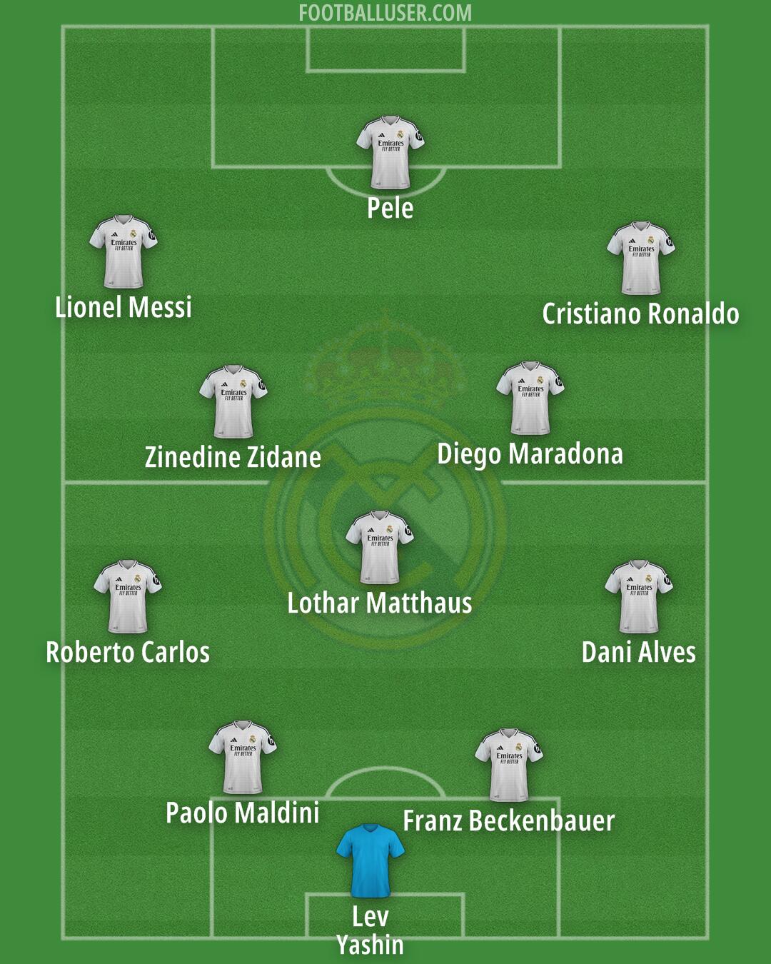Lev (Yashin) · Roberto Carlos · Paolo Maldini · Franz Beckenbauer · Dani Alves · Lothar Matthaus · Diego Maradona · Zinedine Zidane · Pele · Cristiano Ronaldo · Lionel Messi