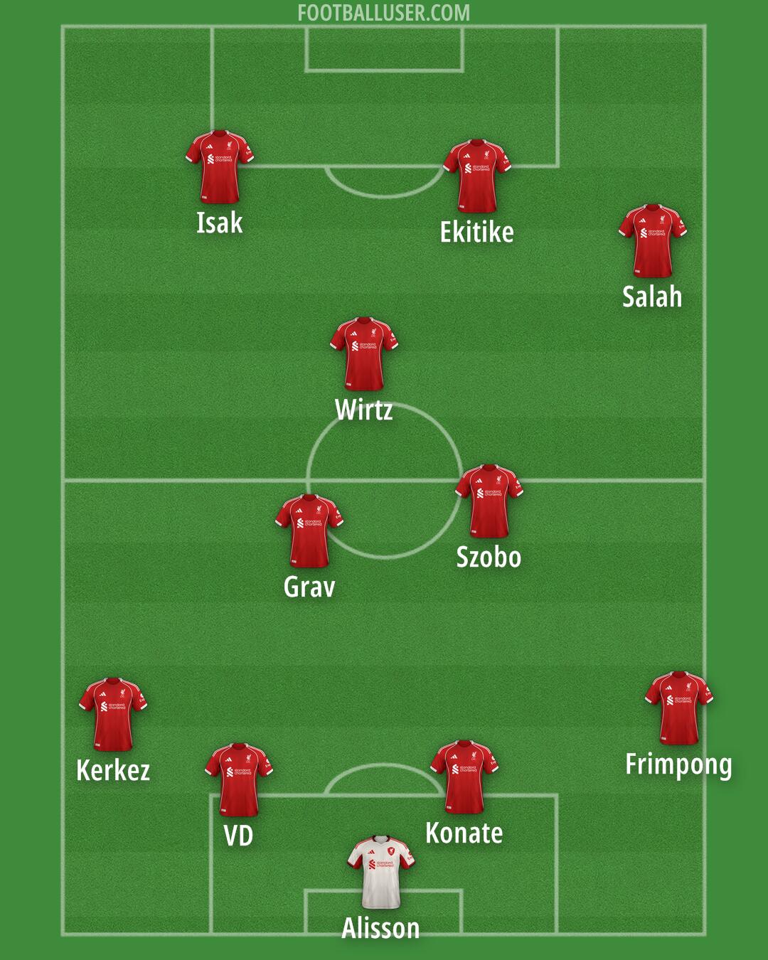 Ekitike · Isak · Salah · Alisson · VD · Konate · Frimpong · Kerkez · Grav · Szobo · Wirtz