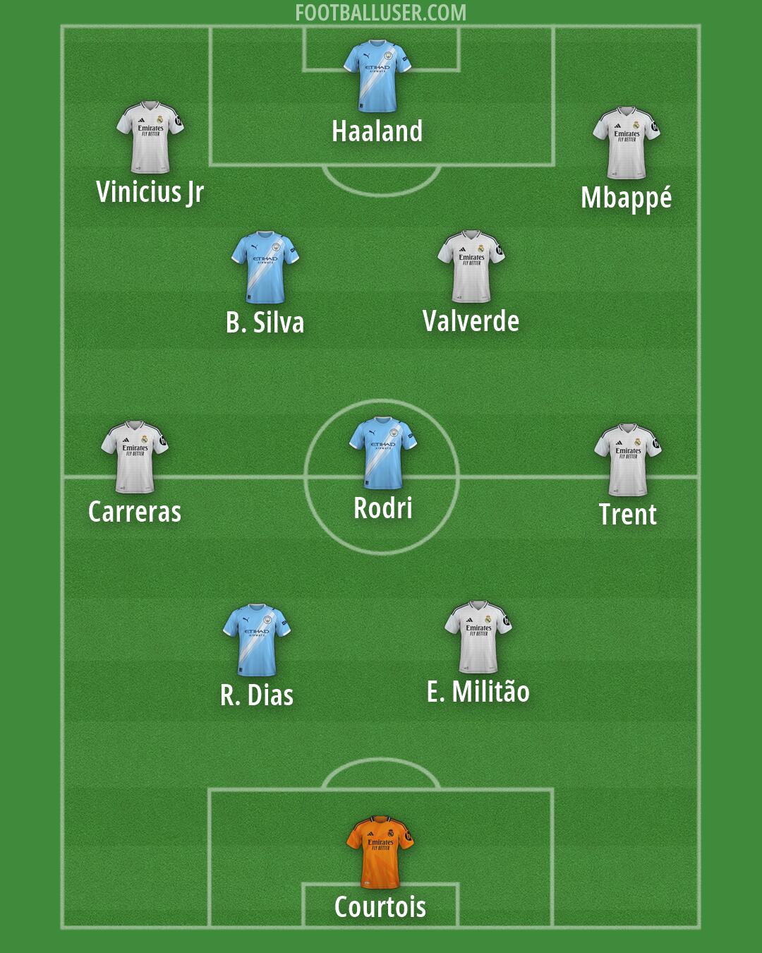 Courtois (Real Madrid) · R. Dias (Man City) · Carreras (Real Madrid) · Trent (Real Madrid) · Rodri (Man City) · B. Silva (Man City) · Haaland (Man City) · E. Militão (Real Madrid) · Valverde (Real Madrid) · Vinicius Jr (Real Madrid) · Mbappé (Real Madrid)