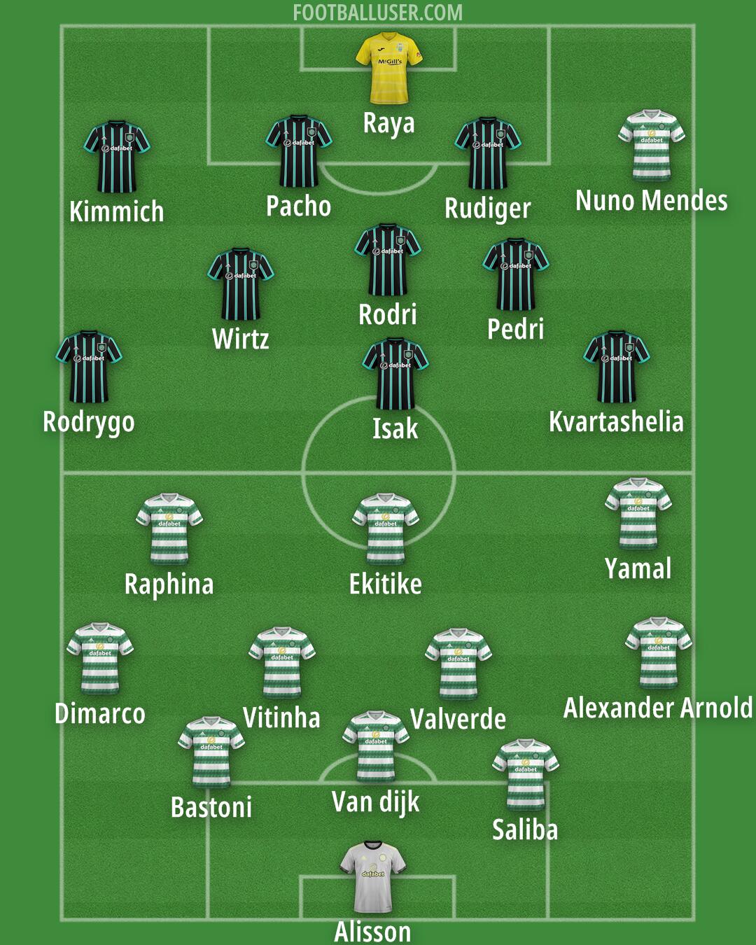 Alisson (Celtic) · Van dijk (Celtic) · Bastoni (Celtic) · Pacho (Celtic) · Saliba (Celtic) · Rudiger (Celtic) · Dimarco (Celtic) · Nuno Mendes (Celtic) · Valverde (Celtic) · Vitinha (Celtic) · Pedri (Celtic) · Rodri (Celtic) · Alexander Arnold (Celtic) · Kimmich (Celtic) · Raphina (Celtic) · Isak (Celtic) · Wirtz (Celtic) · Ekitike (Celtic) · Kvartashelia (Celtic) · Rodrygo (Celtic) · Yamal (Celtic) · Raya (Greenock Morton)I would pay a million to watch that my money is on the Celtic team winning