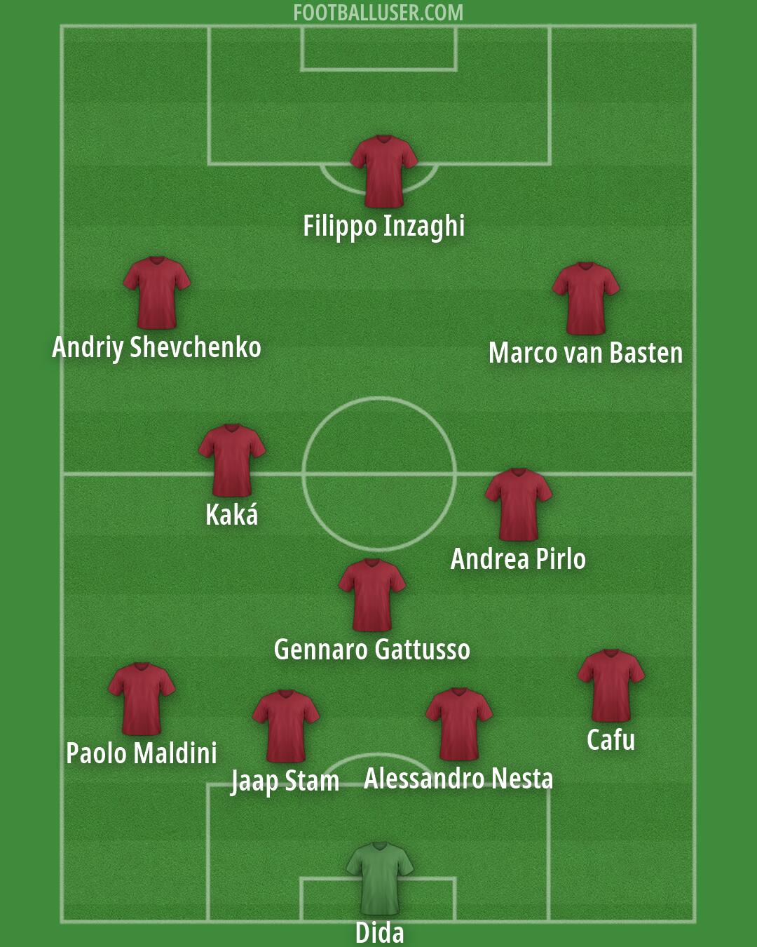 Dida · Jaap Stam · Alessandro Nesta · Paolo Maldini · Cafu · Gennaro Gattusso · Andrea Pirlo · Kaká · Andriy Shevchenko · Filippo Inzaghi · Marco van BastenDream All-Time AC Milan Starting XI