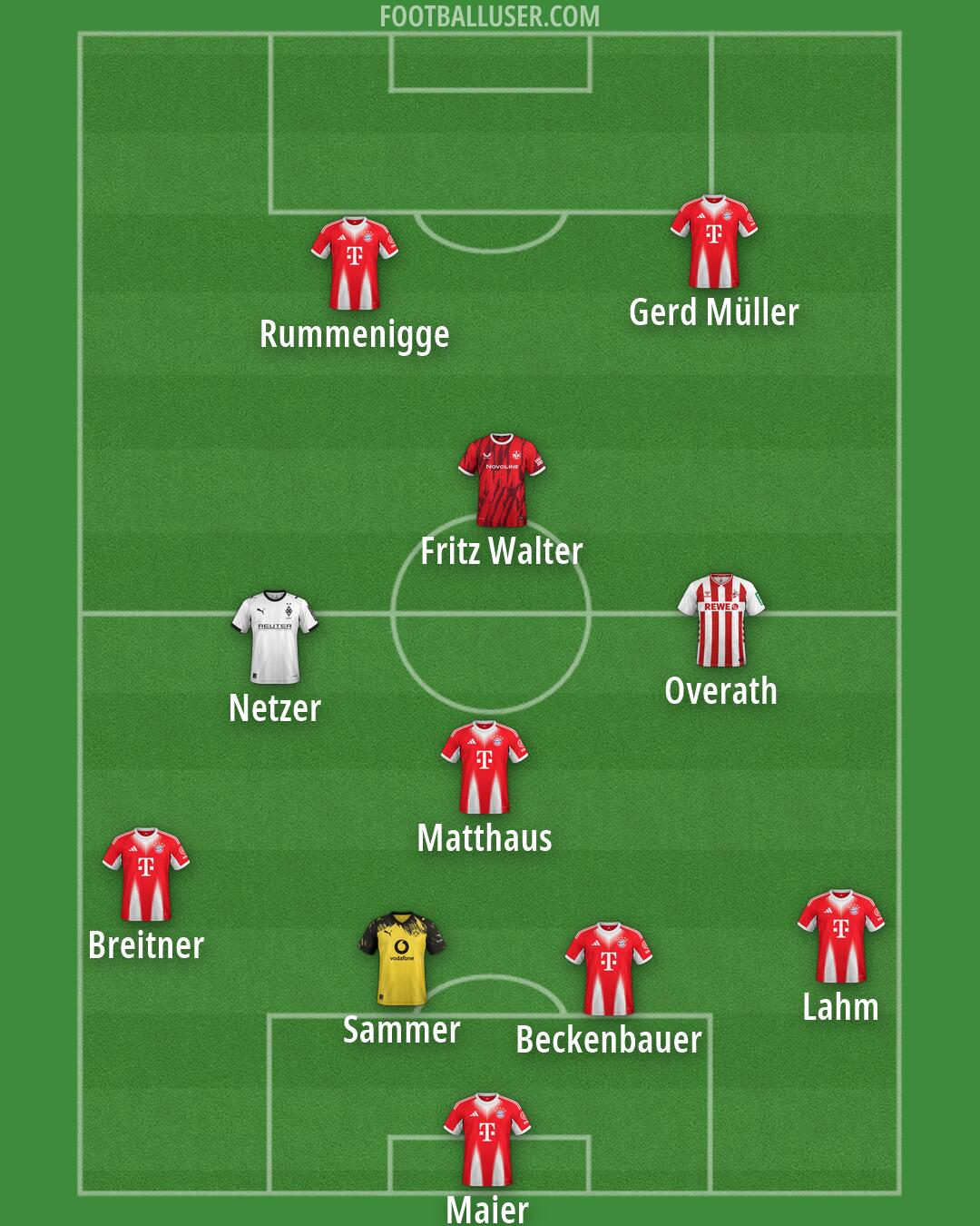 Maier (FC Bayern) · Lahm (FC Bayern) · Beckenbauer (FC Bayern) · Breitner (FC Bayern) · Matthaus (FC Bayern) · Gerd Müller (FC Bayern) · Rummenigge (FC Bayern) · Sammer (Borussia Dortmund) · Overath (Köln) · Netzer (Borussia M'gladbach) · Fritz Walter (Kaiserslautern)