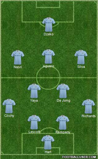 Hart · Kompany · Lescott · Richards · Clichy · Yaya · De Jong · Nasri · Silva · Aguero · Dzeko