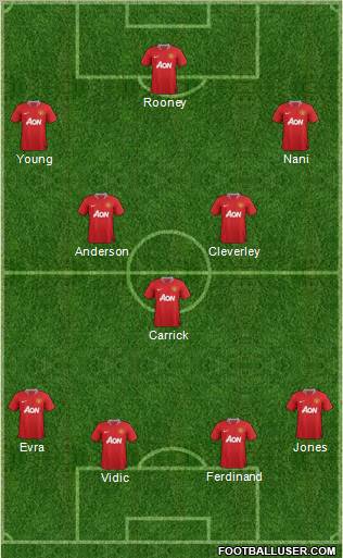 Vidic · Ferdinand · Evra · Jones · Carrick · Anderson · Cleverley · Young · Nani · Rooney