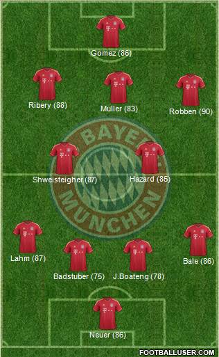 Neuer (86) · Badstuber (75) · J.Boateng (78) · Bale (86) · Lahm (87) · Shweisteigher (87) · Hazard (85) · Robben (90) · Muller (83) · Ribery (88) · Gomez (86)