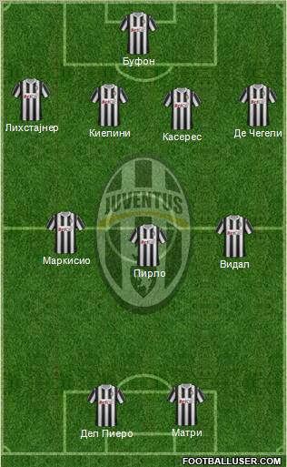Дел Пиеро · Матри · Пирло · Видал · Маркисио · Касерес · Киелини · Де Чегели · Лихстајнер · Буфон