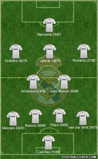 Casillas 31/89 · Marcelo 24/83 · van der Wiel 24/79 · Ramos 26/88 · Pepe 29/85 · Anderson 24/79 · Xabi Alonso 30/86 · Drenthe 25/75 · Leitner 19/75 · Ronaldo 27/93 · Benzema 24/87
