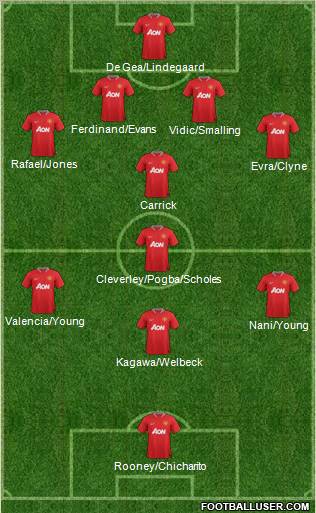 Rooney/Chicharito · Kagawa/Welbeck · Nani/Young · Valencia/Young · Cleverley/Pogba/Scholes · Carrick · Evra/Clyne · Rafael/Jones · Vidic/Smalling · Ferdinand/Evans · De Gea/LindegaardYou have a 2 good goalkeepers, both very promising, 2 young RB's, reliable, 4 CBs, experienced/young, and 2 LB, experienced/young. In the mid, Carrick, we all know what he can do, with Cleverley/Scholes next to him (scholes is better, but Cleverley has a great touch with more stamina and he also likes to carry the ball forward). Then you have Valencia/Young/Nani(/Giggs) on the wings, all great, can run up and down the field all day long, capable of creating space for dangerous crosses into the box, if not going in there on there own. Then in between them, Kagawa, I think he is what Utd need, he can go on the wing, in mid, or even up front with Rooney, and Welbeck is there when you need him. Up front, you have Rooney, no need to say more, with Chicharito replacing him in the end when he starts getting tired or frustrated.