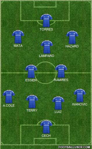 CECH · LUIZ · TERRY · A.COLE · IVANOVIC · ESSIEN · RAMIRES · LAMPARD · HAZARD · MATA · TORRESSubstitutes or alternative players: