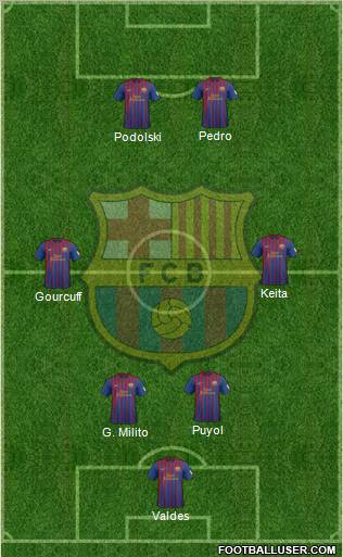 Valdes · G. Milito · Puyol · Gourcuff · Keita · Podolski · Pedro