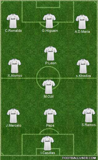 I.Casillas · J.Marcelo · Pepe · S.Ramos · M.Ozil · s.Khedira · X.Alonso · P.Leon · A.D.Maria · C.Ronaldo · G.Higuain